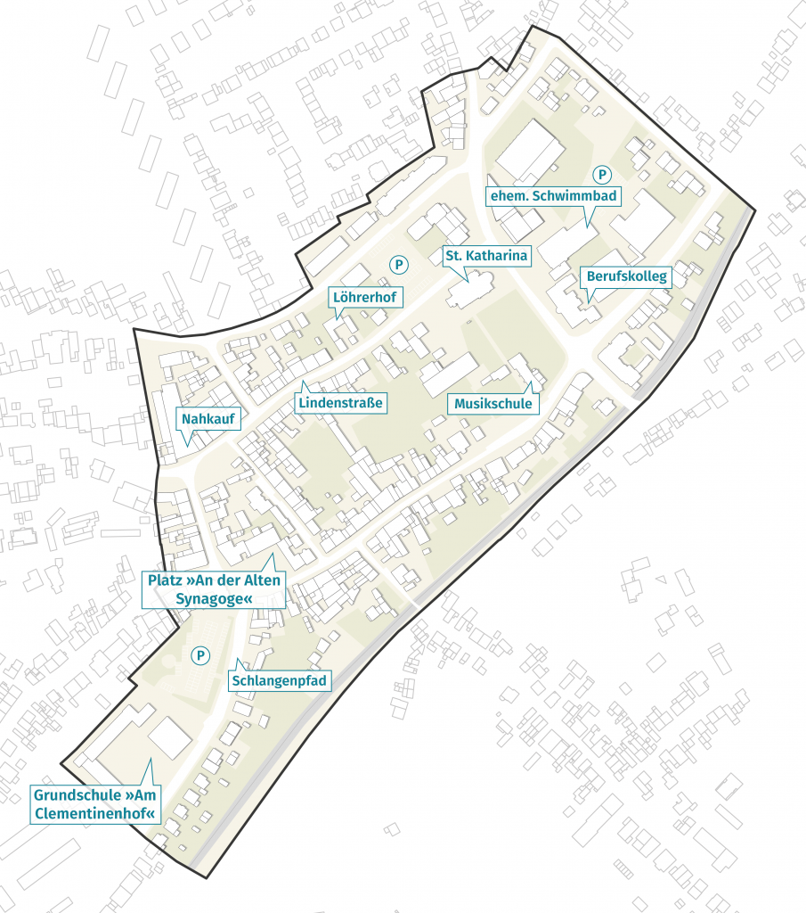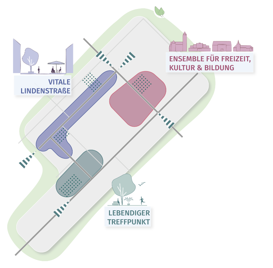 Für jedes Handlungsfeld wurden Ziele definiert und Maßnahmen entwickelt, die wiederum räumlich in den drei Lupenräumen Vitale Lindenstraße, Lebendiger Treffpunkt rund um den Platz an der Alten Synagoge und den „Kirmesplatz“ sowie Ensemble für Freizeit, Kultur und Bildung rund um St. Katharina und das ehemalige Schwimmbad verortet sind.